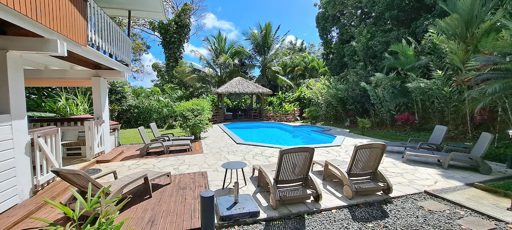 Située à l'étage sur un beau parquet en bois exotique, les fenêtres donnent sur le jardin arboré.
